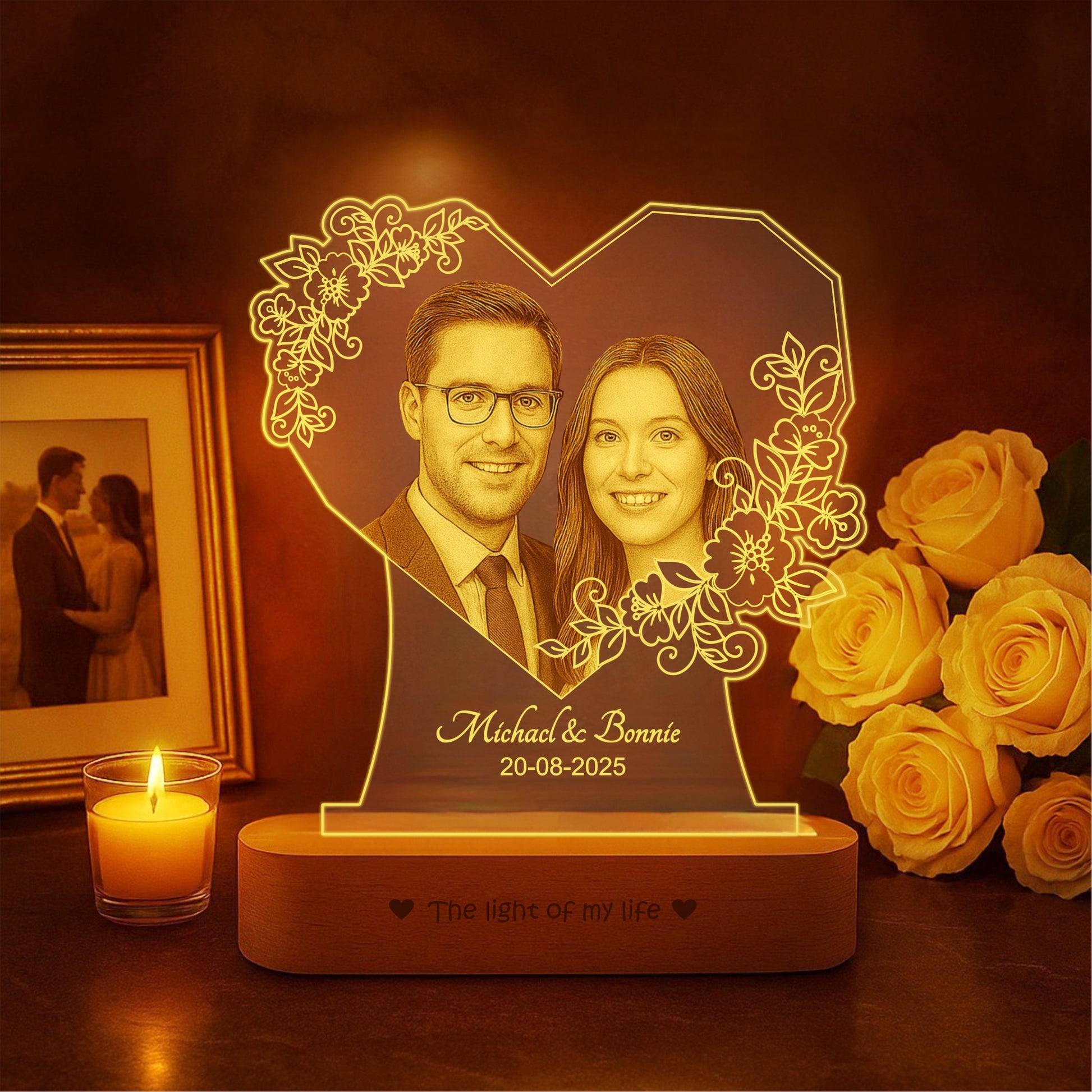 With its exquisite engraving, warm light, and hand-polished wooden base, this lamp is a visual and emotional masterpiece. It’s an artistic representation of your bond that will make your anniversary, or any special occasion, even more memorable.